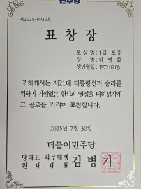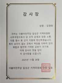 2025년 11월 28일 더불어민주당 달성군지역위원회 당원여러분께서 감사장을 주셨습니다. 사무국장으로서 당조직 운영과 당원소통 각종 행사와 선거지원에 헌신한 공로에 감사의 뜻을 전해주셨습니다.