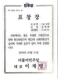 더불어민주당의 당원으로 4기 민주정부 창출을 위해 노력한 공로를 인정받아 표창장을 수상하였습니다.