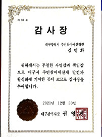 대구광역시 주민참여예산 위원 대구시장 감사장/ 달성군 김명화