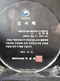 예산바로쓰기 국민감시단으로 활동하며 지방재정 건전화에 크게 기여하였기에 감사패를 행정안전부장관으로부터 수상함