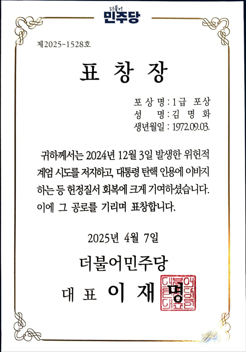 달성군 다사출마 예정자 김명화는 2024년 12월 3일 발생한 위헌적 계엄 시도를 저지하고, 대통령 탄핵 인용에 이바지하는 등 헌정질서 회복에 크게 기여하여 그 공로로 1급 표창을 받았습니다.