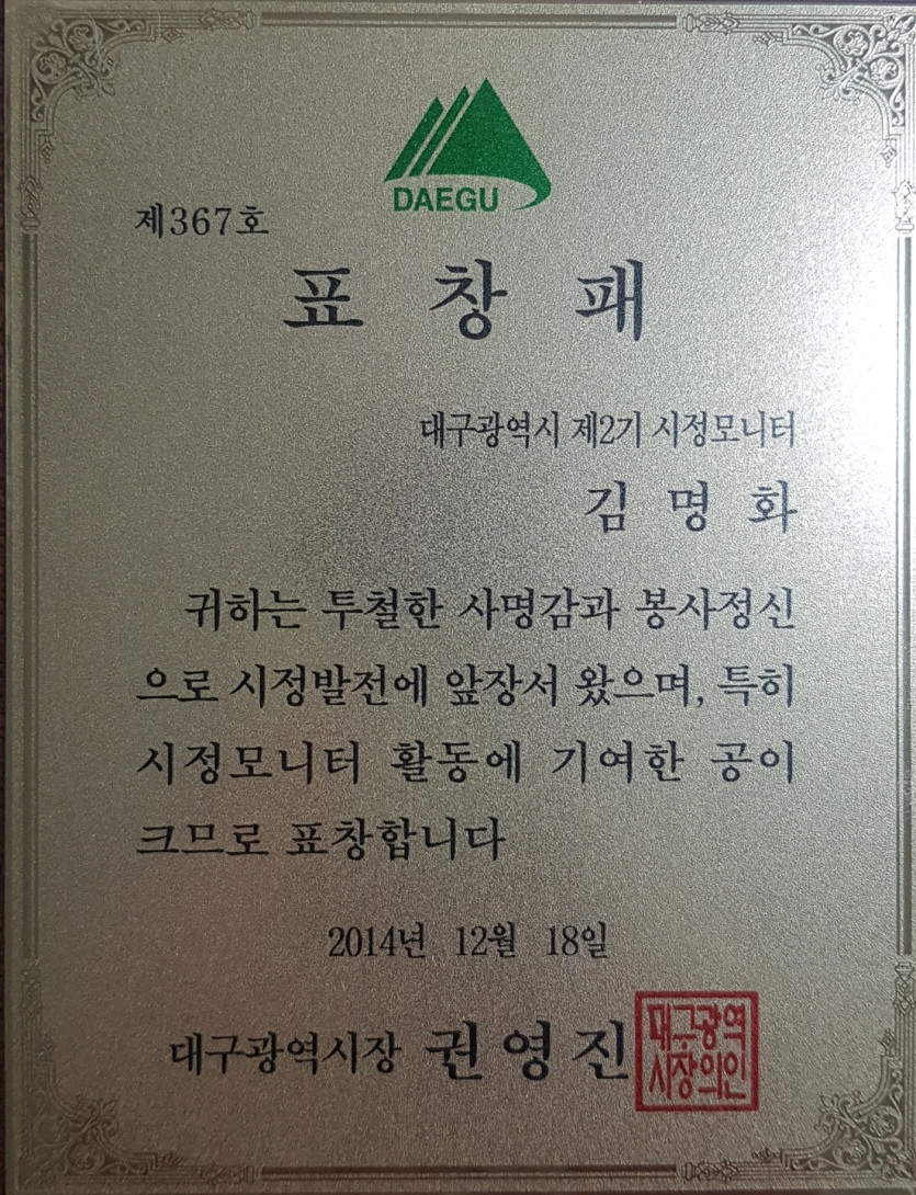 투철한 사명감과 봉사정신으로 시정발전에 앞장서 왔으며, 특히 시정모니터 활동에 기여한 공으로 대구광역시장을 수상함