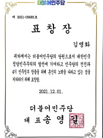 더불어민주당의 당원으로 4기 민주정부 창출을 위해 노력한 공로를 인정받아 표창장을 수상하였습니다.