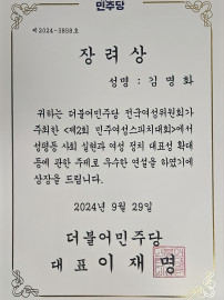2024년 9월 29일 전국여성위원회가 주최한 제2회 민주여성스피치대회에서 성평등 사회 실현과 여성 정치 대표성확대에 관한 주제로 연설을 하여 장려상을 수상하였습니다.