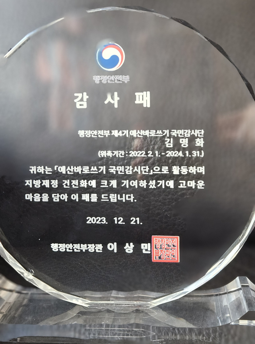 예산바로쓰기 국민감시단으로 활동하며 지방재정 건전화에 크게 기여하였기에 감사패를 행정안전부장관으로부터 수상함