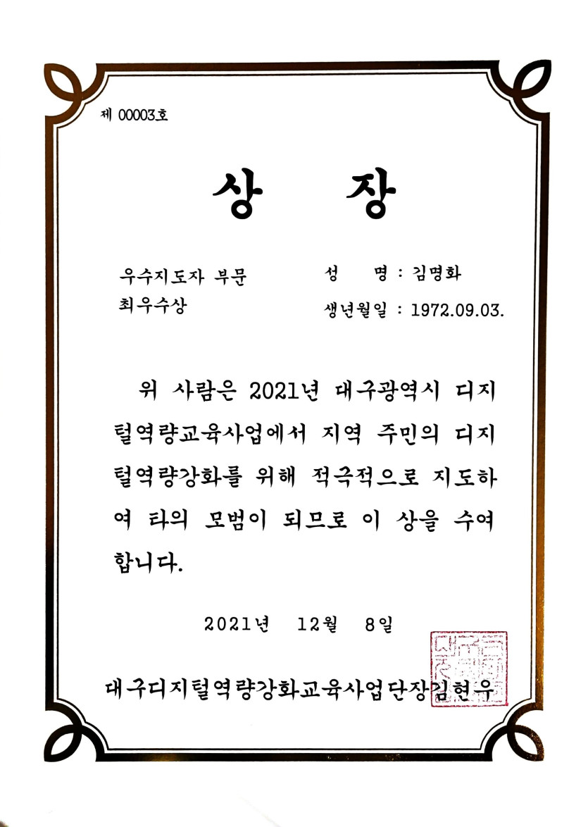 2021년 대구광역시 디지털역량교육사업에서 지역주민의 디지털역량강화를 위해 적극적으로 지도하여 최우수상을 수상합